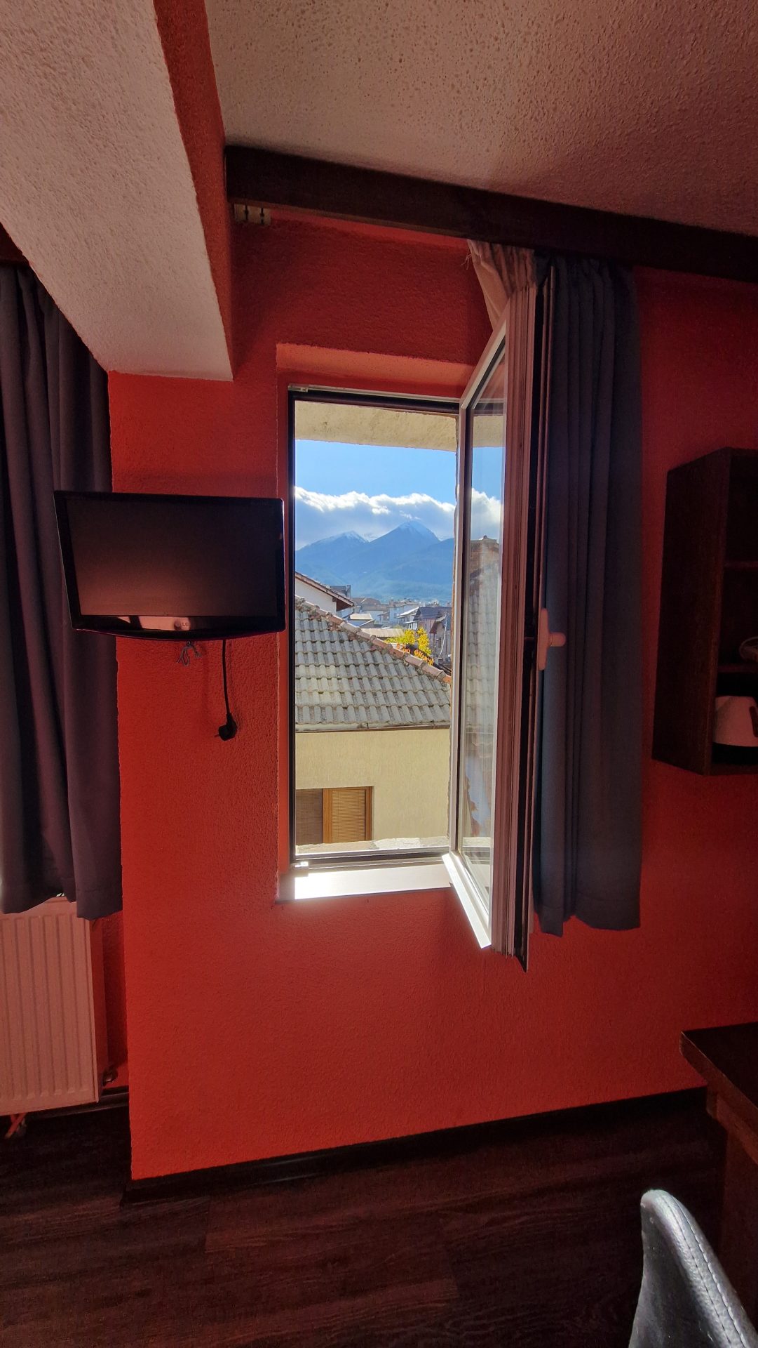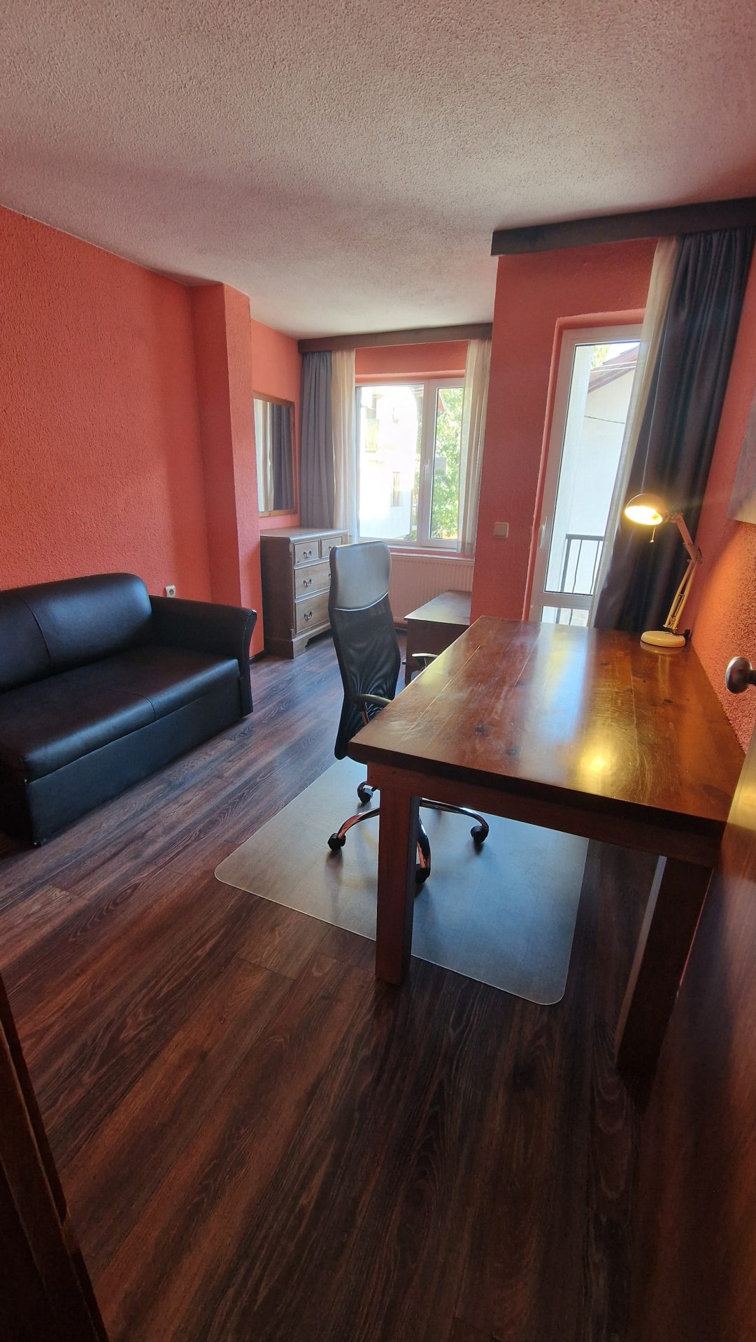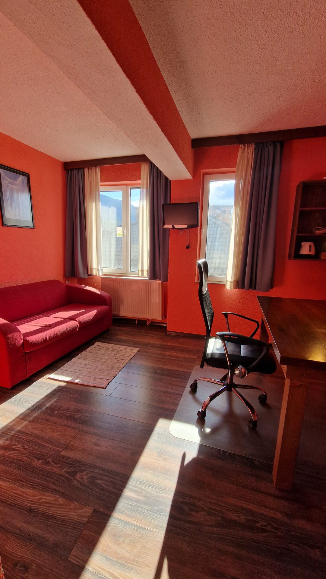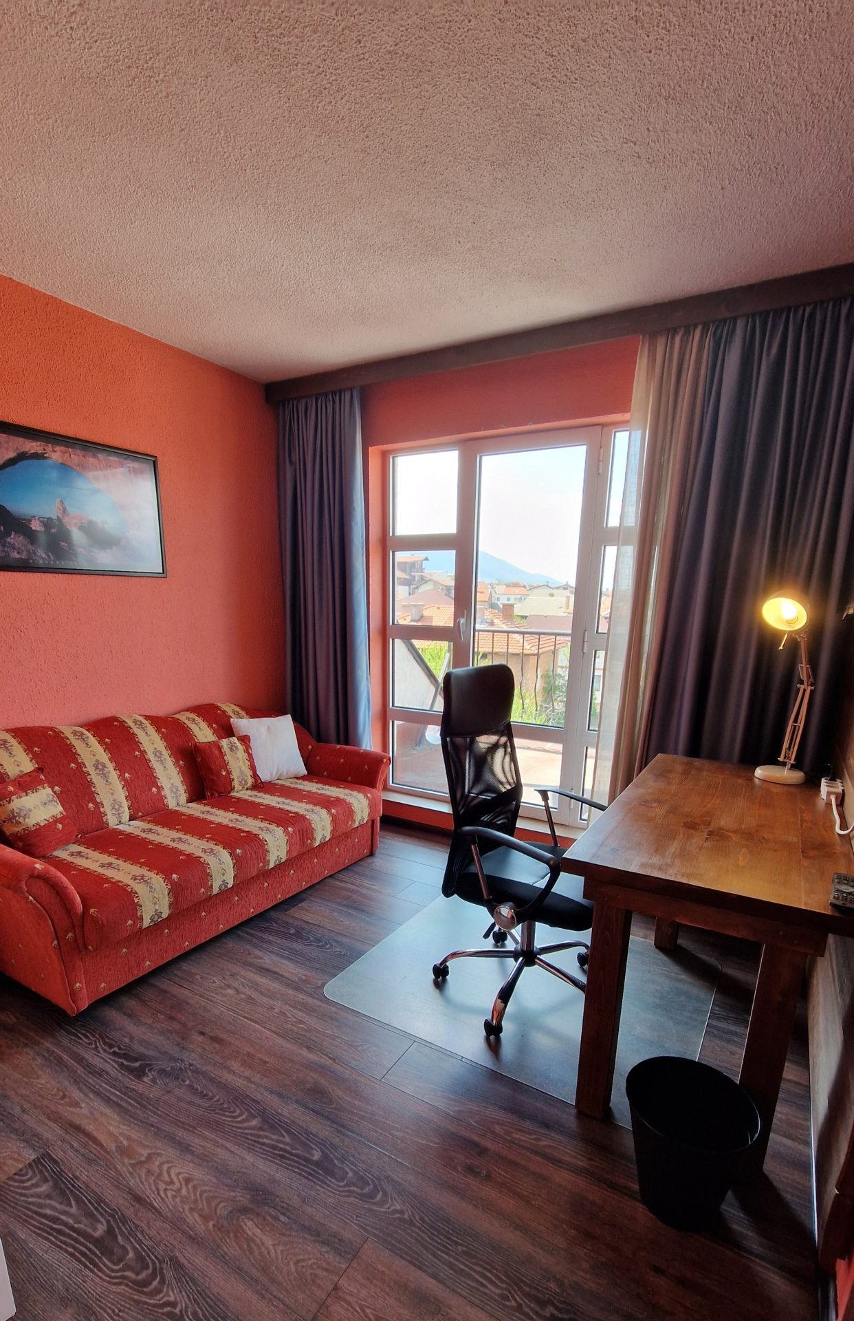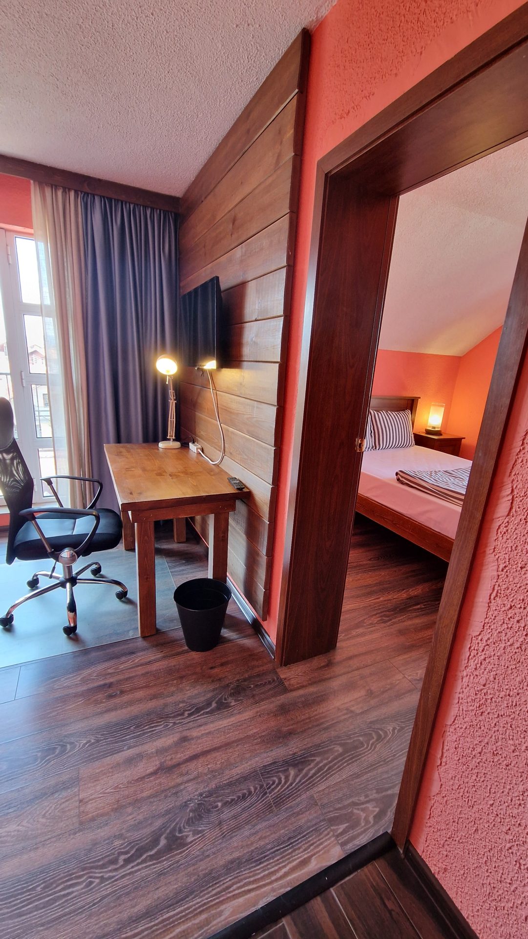One small bedroom with double bed, separate living room with big desk, office chair, bathroom. Some of the mini apartments have big balconies and mountain view.